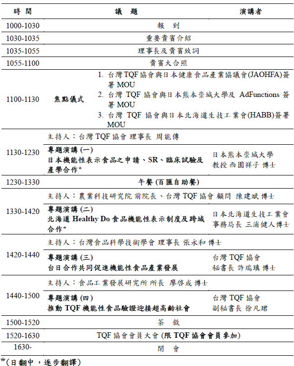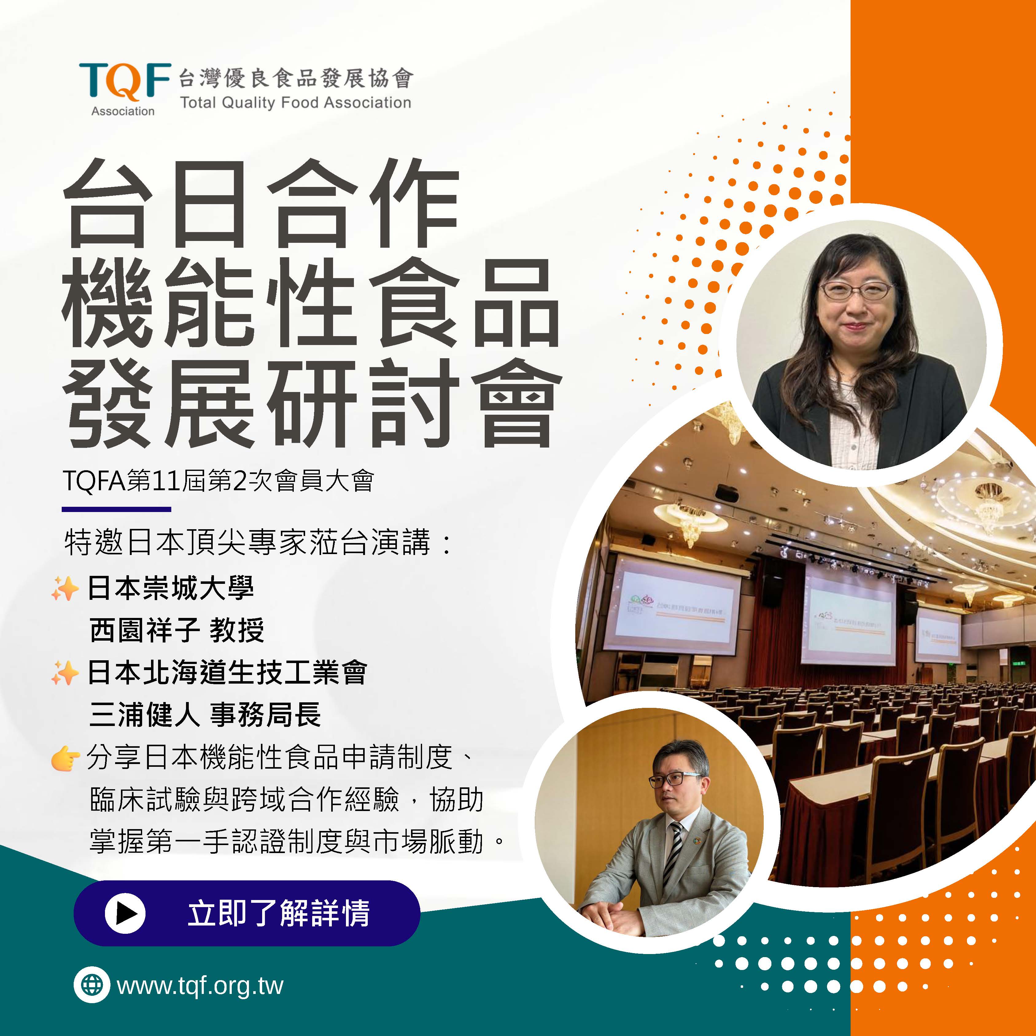 一、活動說明:隨著全球消費者日漸重視保健需求,機能性食品已成為產業升級與市場拓展的重要課題,惟機能性食品的認定及品質管理,各國在法律規範及自主管理上存在差異,為促進機能性食品的國際貿易及產銷需求,本研討會擬聚焦於台灣與日本間的制度差異及發展現況的認知,因此特邀請日本機能標示食品理論與實務兼具的日本崇城大學 西園祥子教授與發展日本地方特色產品的食品機能性表示制度先驅的日本北海道生技工業會 三浦健人事務局長,分享有關日本機能性表示食品的申請制度、臨床試驗及跨域合作經驗,協助業者深入了解日本機能性食品的認證制度與市場動態。同時,由本會台日合作共同推動機能性食品產業發展計畫,並介紹本會全新制定的TQF機能性食品驗證方案,以增進台日機能性食品產業的供應鏈及價值鏈的合作機會。