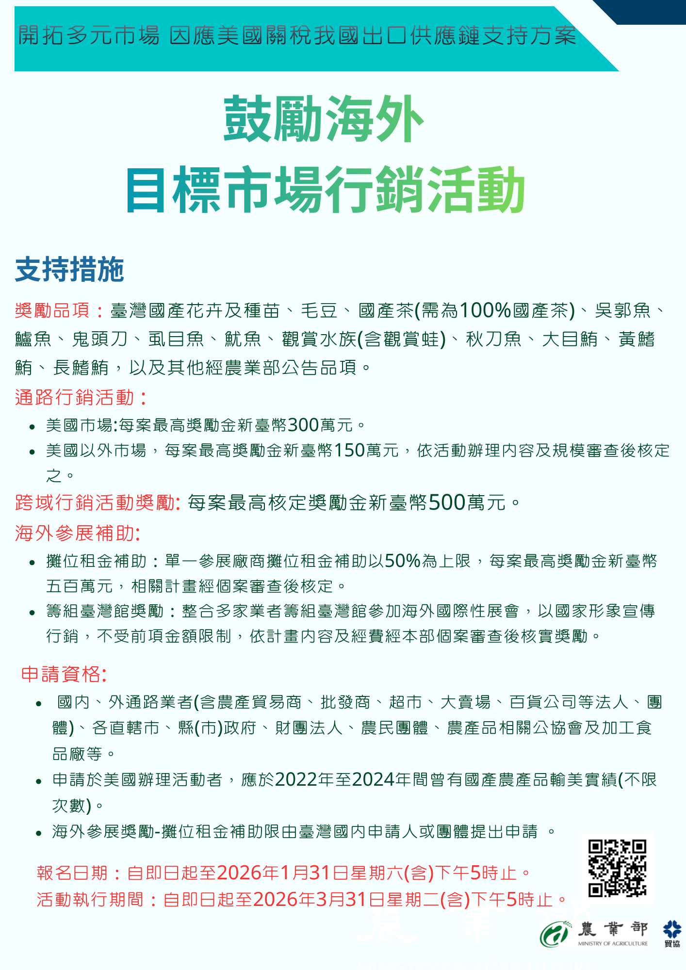 檢送農業部「因應美國關稅鼓勵海外目標市場行銷活動支持措施」說明書1份,請查照並協助推廣。