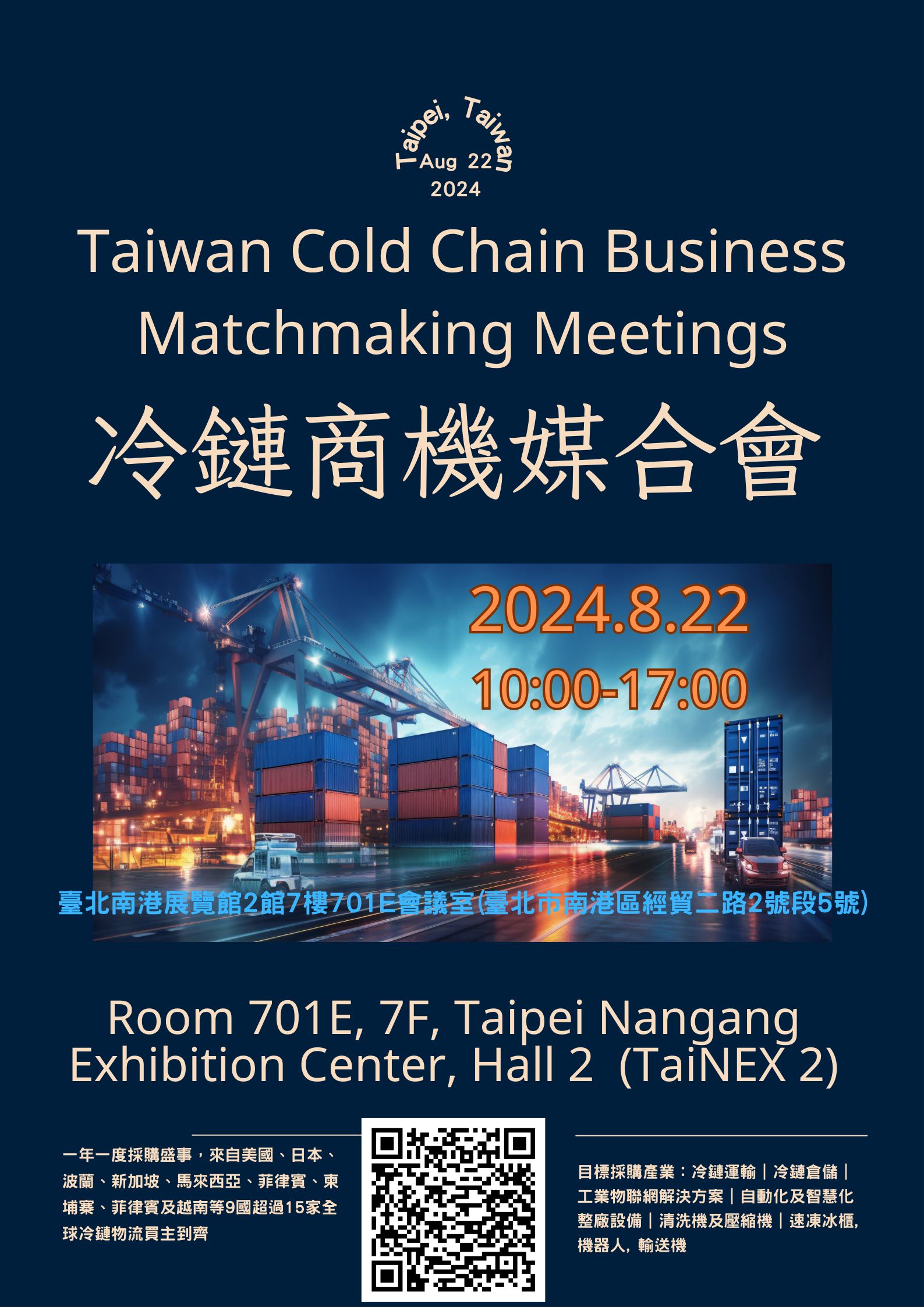 為協助我冷鏈業者爭取國際商機,本會訂於本(113)年8月22日於台北南港展覽館2館7樓701E會議室理旨揭活動,特邀來自美國、日本、波蘭、新加坡、柬埔寨、菲律賓、越南、馬來西亞及泰國等9國20家外商來臺洽談。