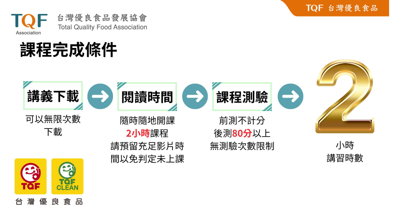 - 將於課程結束後一個月內將衛生講習時數登錄於【食品衛生安全課程資訊管理系統】(無提供紙本時數卡/時數條)。若未依規定進行/完成,則無法取得時數。